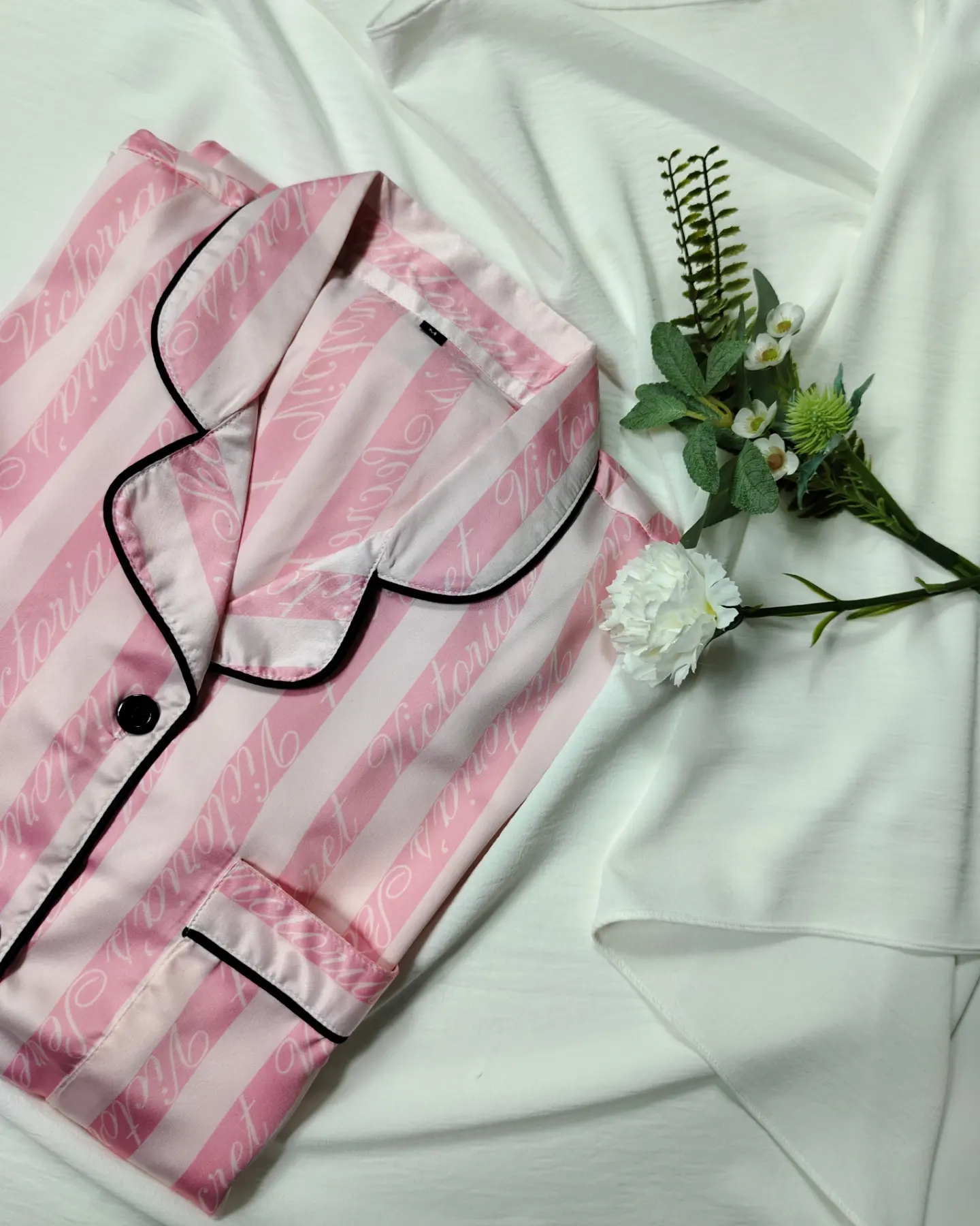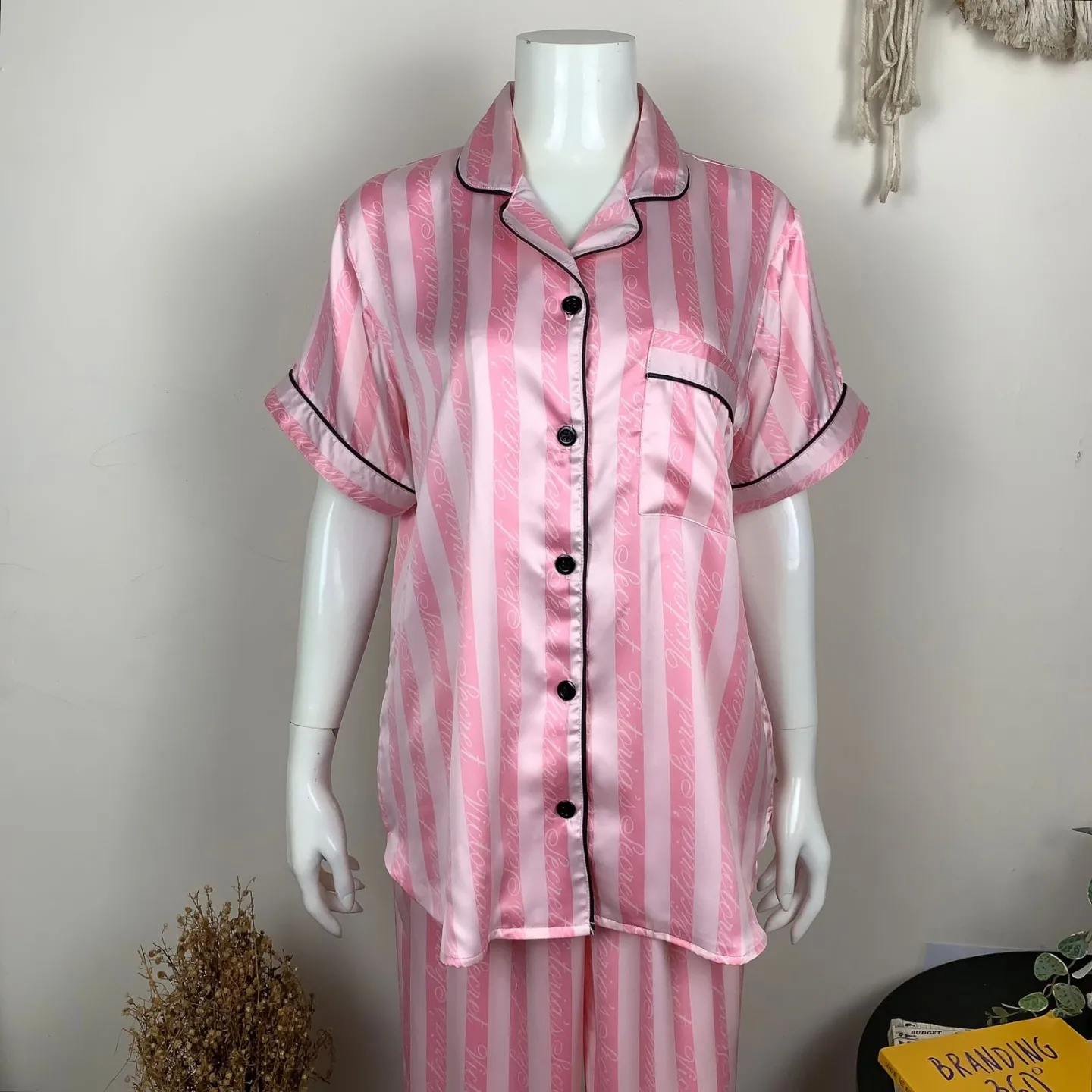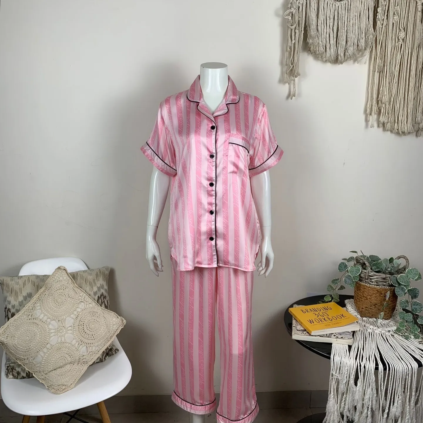 Modelnya two-piece set — atasan berkancing depan dan celana panjang dengan potongan loose — memberikan kenyamanan maksimal untuk beristirahat atau menikmati me time penuh gaya.