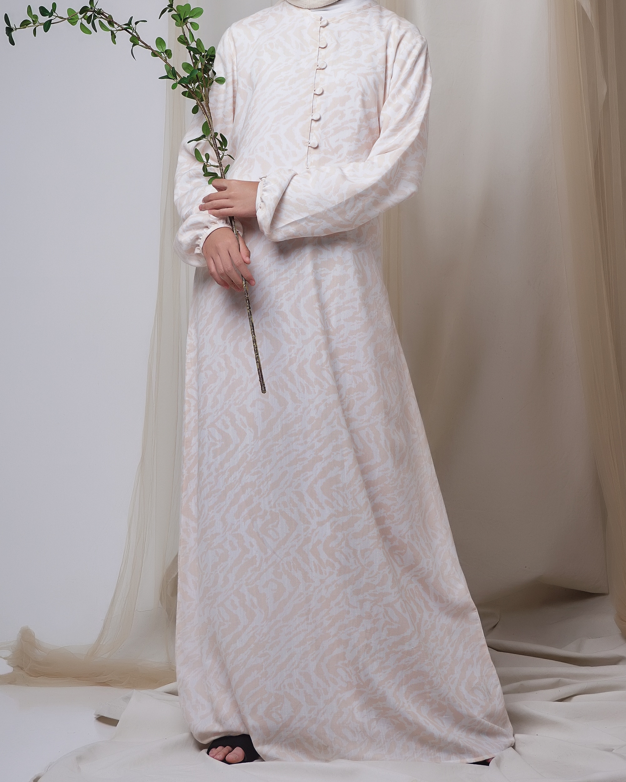 Detail kancing kecil vertikal di bagian depan menjadi aksen manis yang mempertegas kesan minimalis dan elegan. Potongannya longgar dan jatuh anggun, memeluk tubuh tanpa membatasi gerak, memberikan rasa tenang yang menjadi ciri khas setiap busana Khakeen.