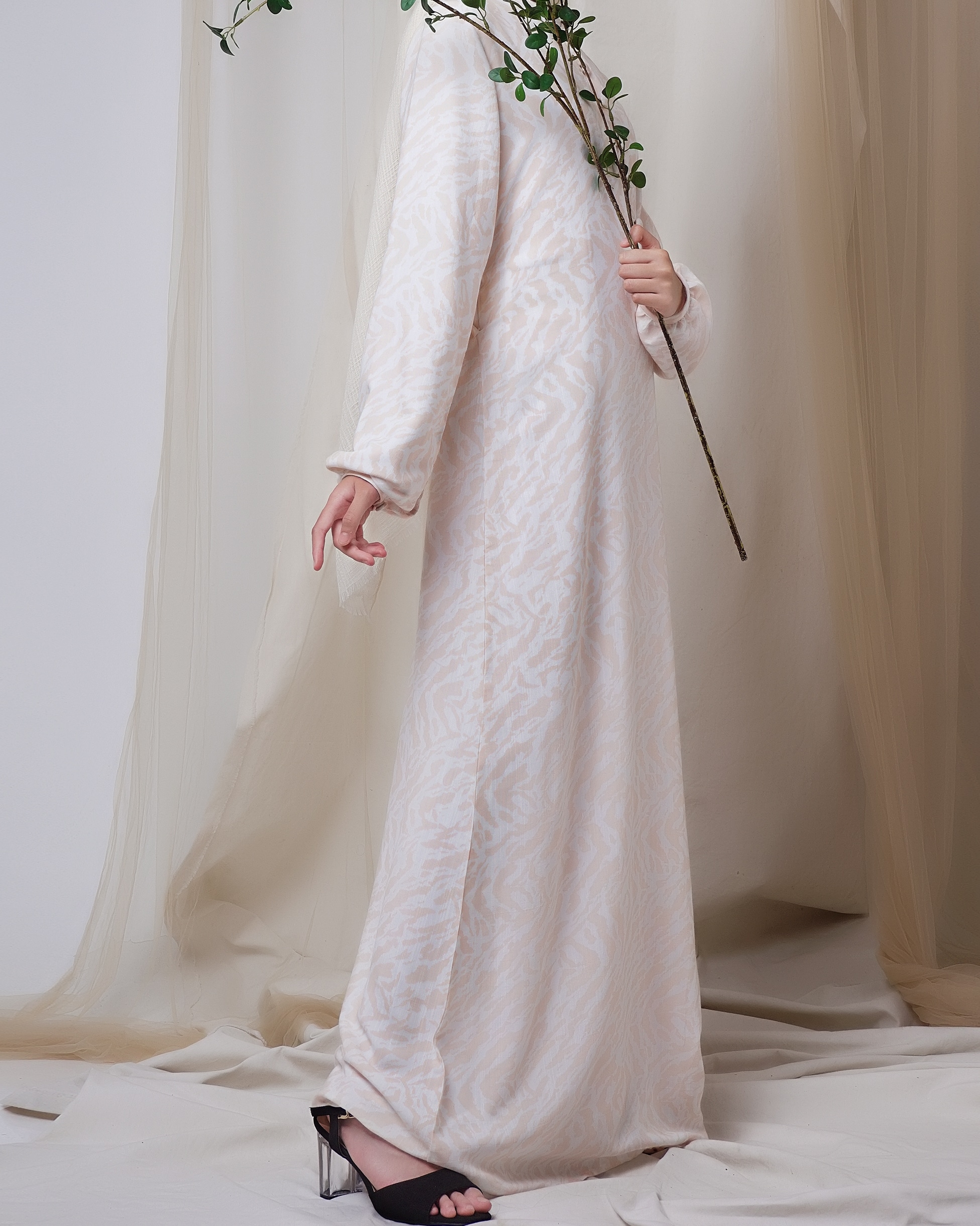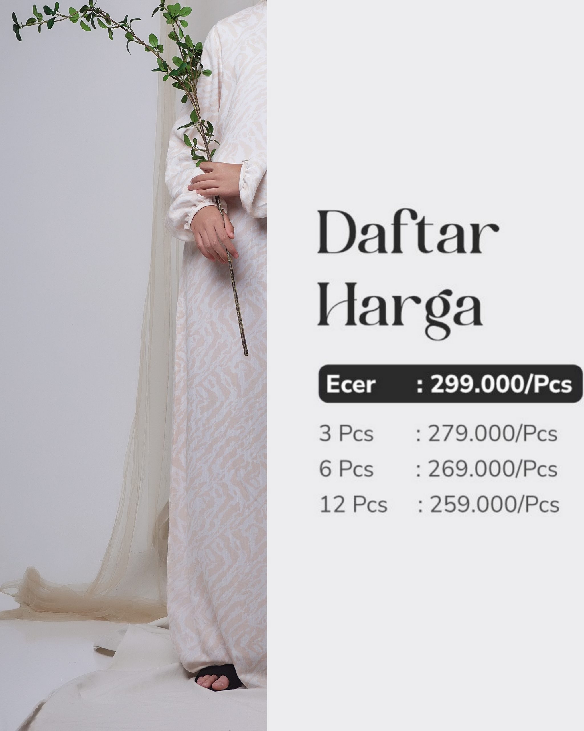 Warna cream beige lembut memancarkan aura ketenangan dan kemurnian, menjadikan Gamis Alana simbol dari keanggunan yang sederhana, namun penuh makna