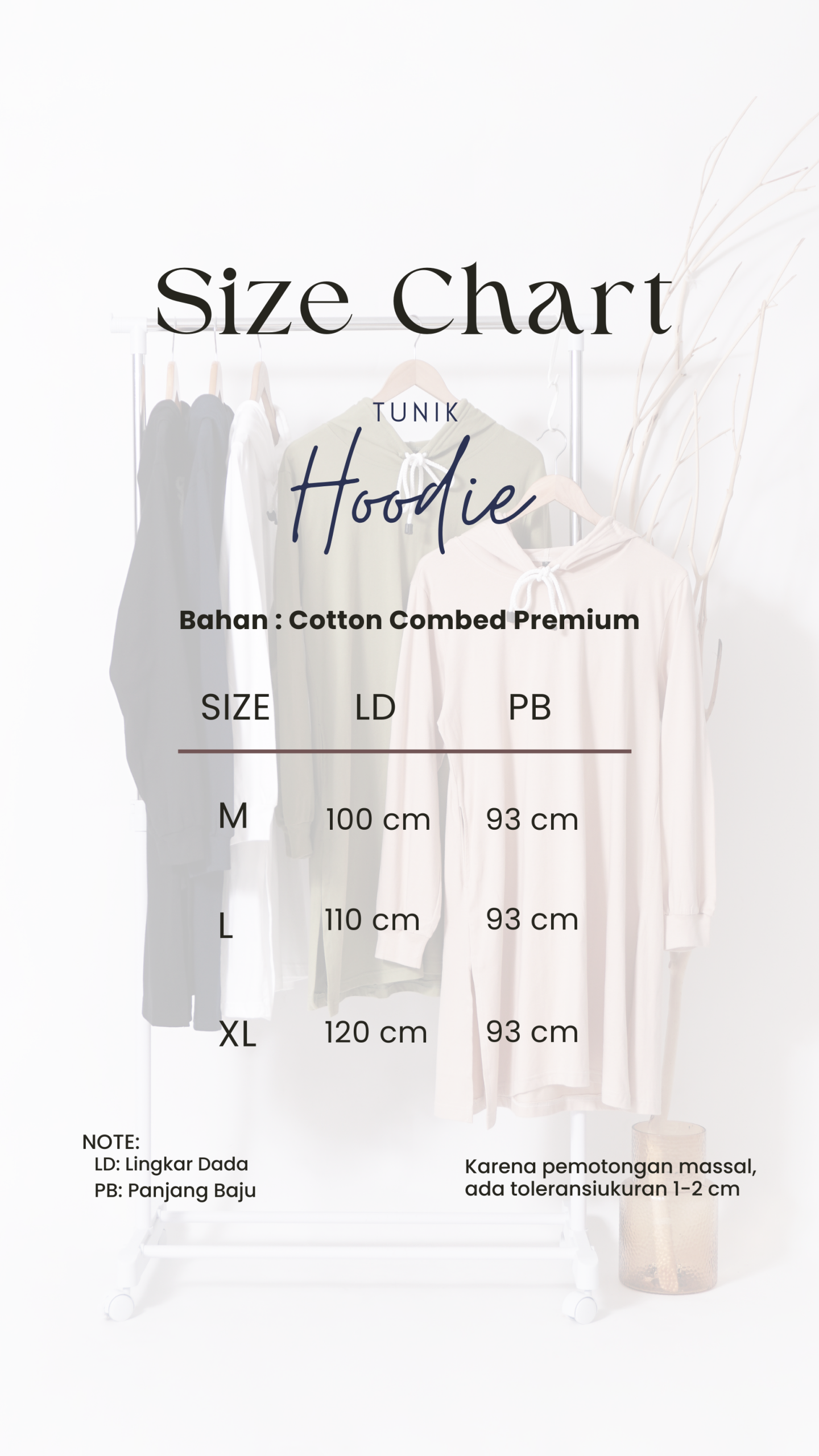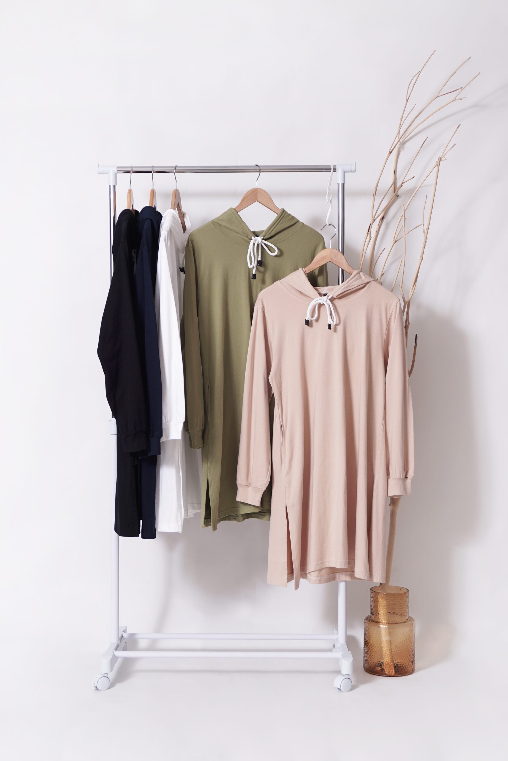 Didesain dengan model oversize hoodie yang simpel namun elegan, tunik ini hadir dalam berbagai warna lembut seperti mocca, sage, navy, putih, dan hitam.