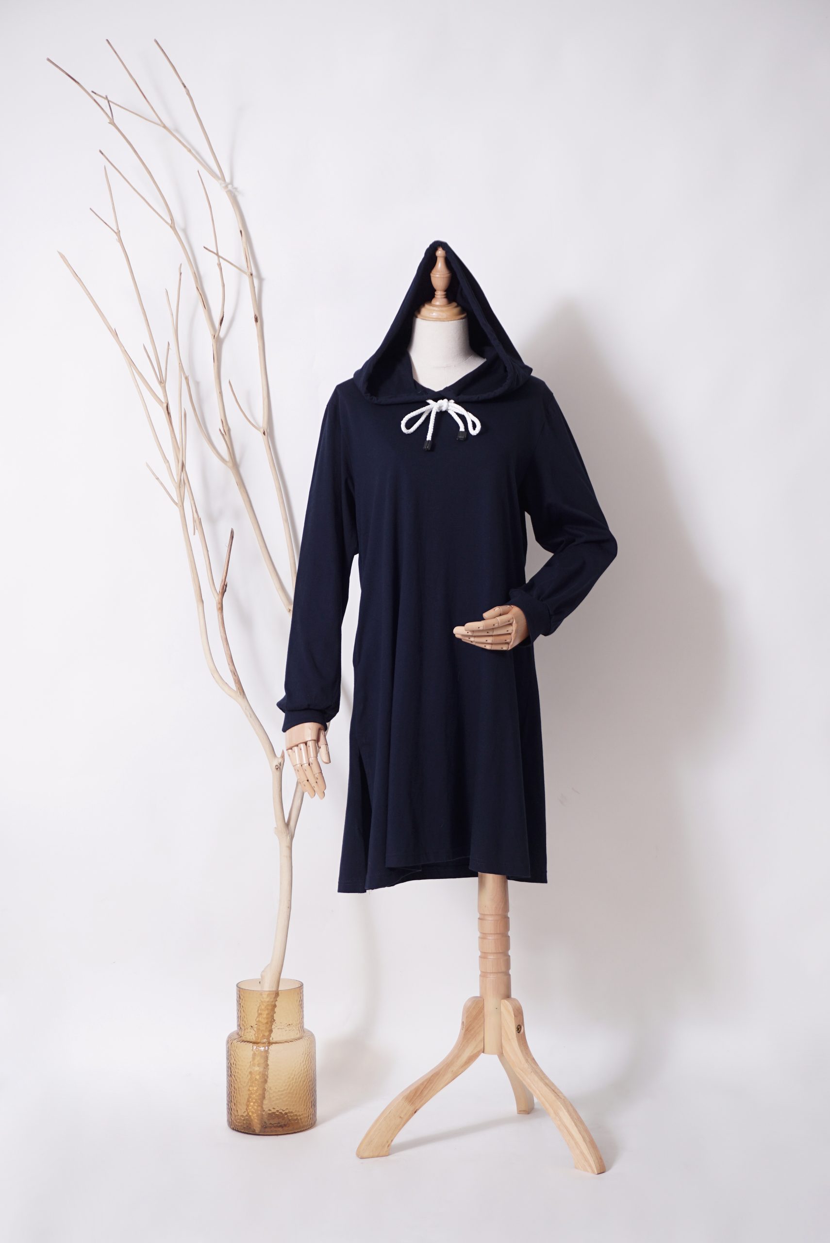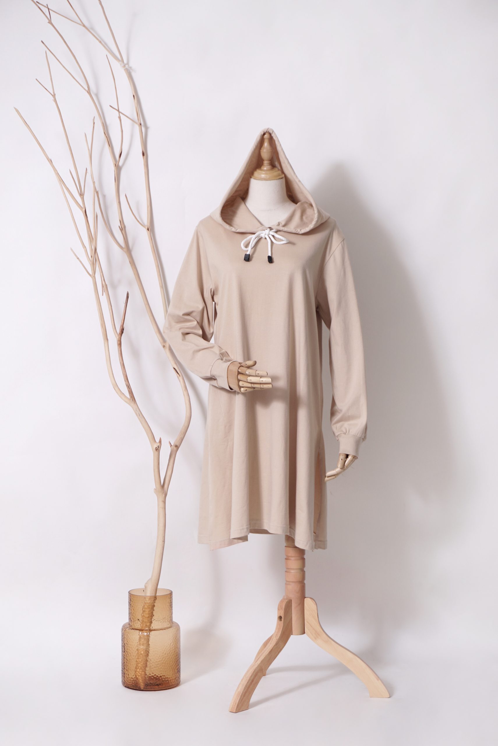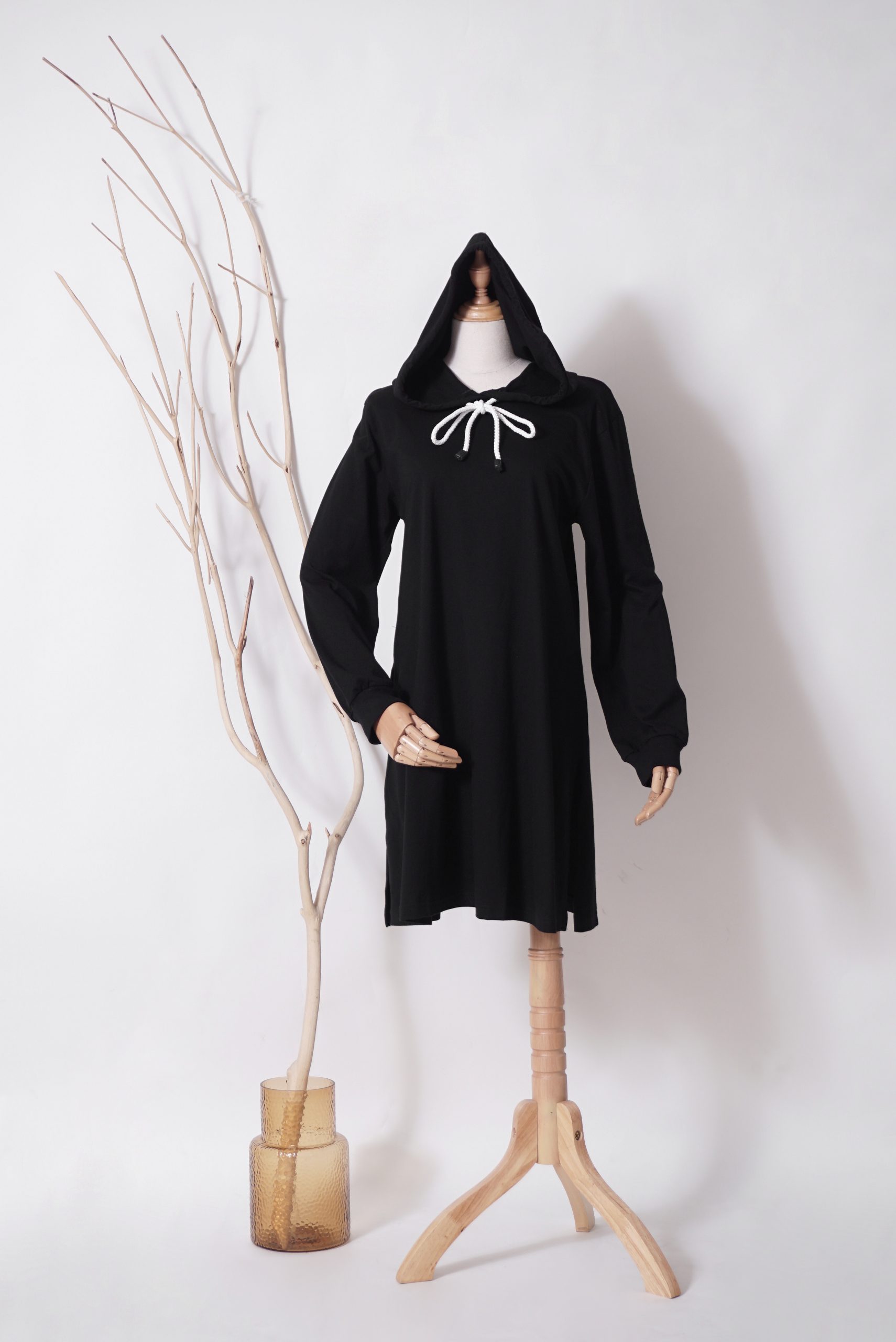 Detail hoodie dengan tali putih memberi kesan sporty dan modern, sementara panjang tunik yang menutupi bagian tubuh membuatnya tetap sopan untuk digunakan sehari-hari.